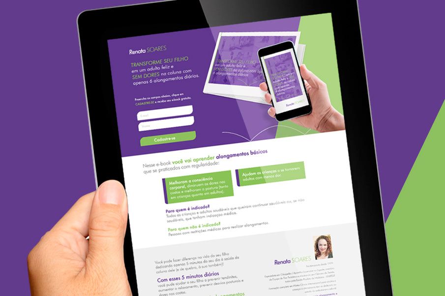 A BV\DSGN criou a identidade visual para 1º e-book da fisioterapeuta Renata Soares. O projeto ainda compreendia a página do hot site para realizar as vendas do e-book e de divulgação nas redes sociais.